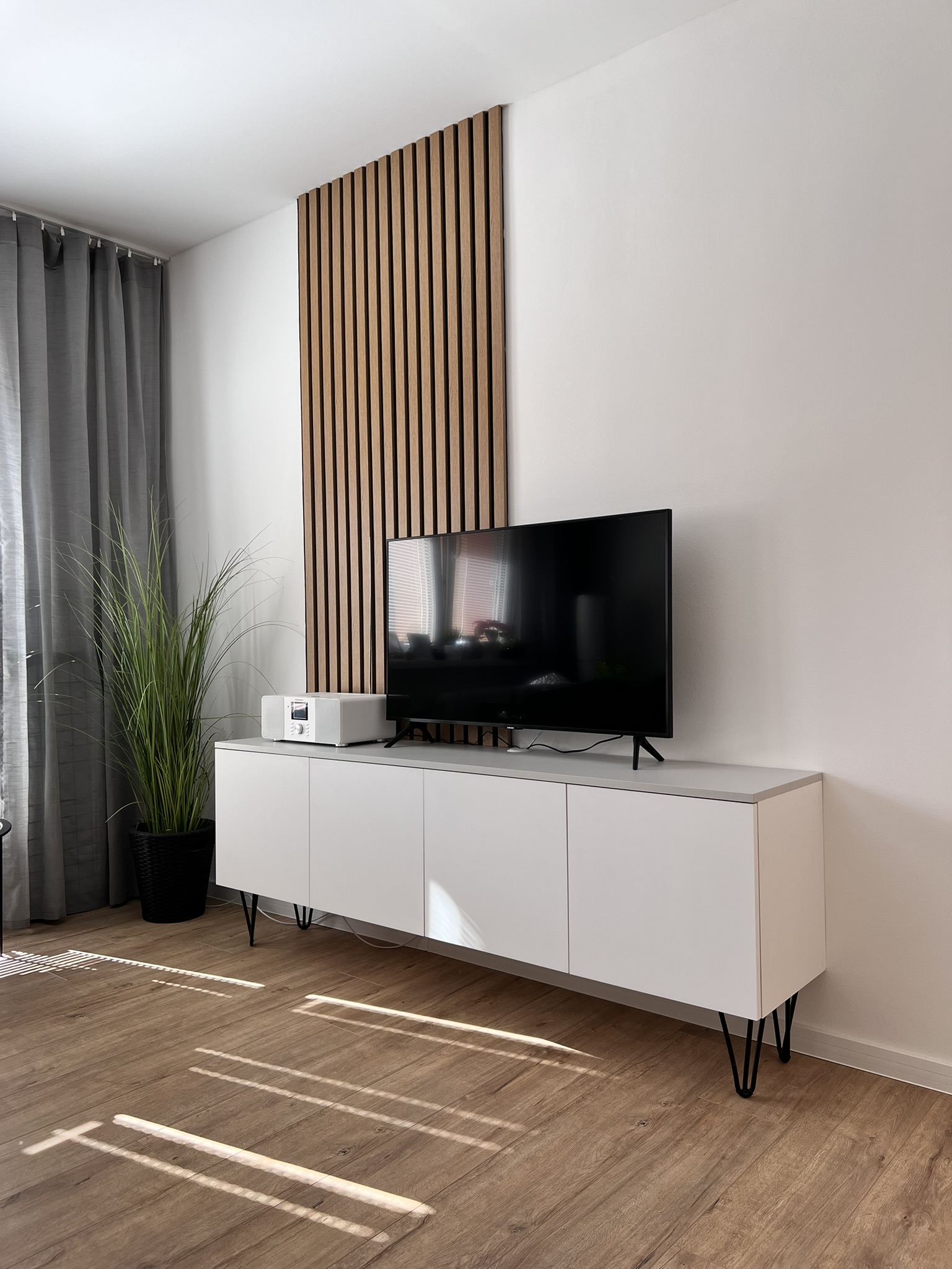 Bílý televizní stolek s lamelami je moderní řešení do obývacího pokoje, které kombinuje čistý design, praktičnost a elegantní přírodní detail.