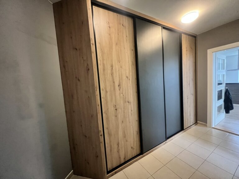 Moderní závěsný televizní stolek v kombinaci s lamelovým obkladem vytváří elegantní a stylové řešení pro obývací pokoj. Díky zavěšenému provedení působí nábytek lehce a vzdušně, zároveň usnadňuje úklid pod nábytkem a dodává interiéru moderní vzhled.