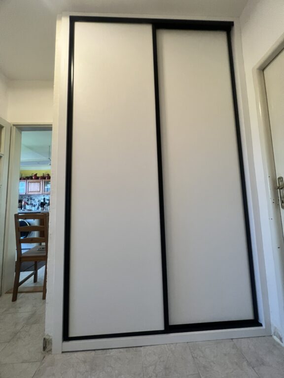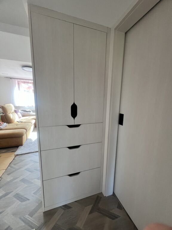 Moderní vestavěná skříň se čtyřmi posuvnými dveřmi nabízí velkorysý úložný prostor a elegantní řešení pro ložnici. Díky posuvnému systému dveří je skříň velmi praktická i v menších místnostech, protože nevyžaduje prostor pro otevírání klasických dveří.